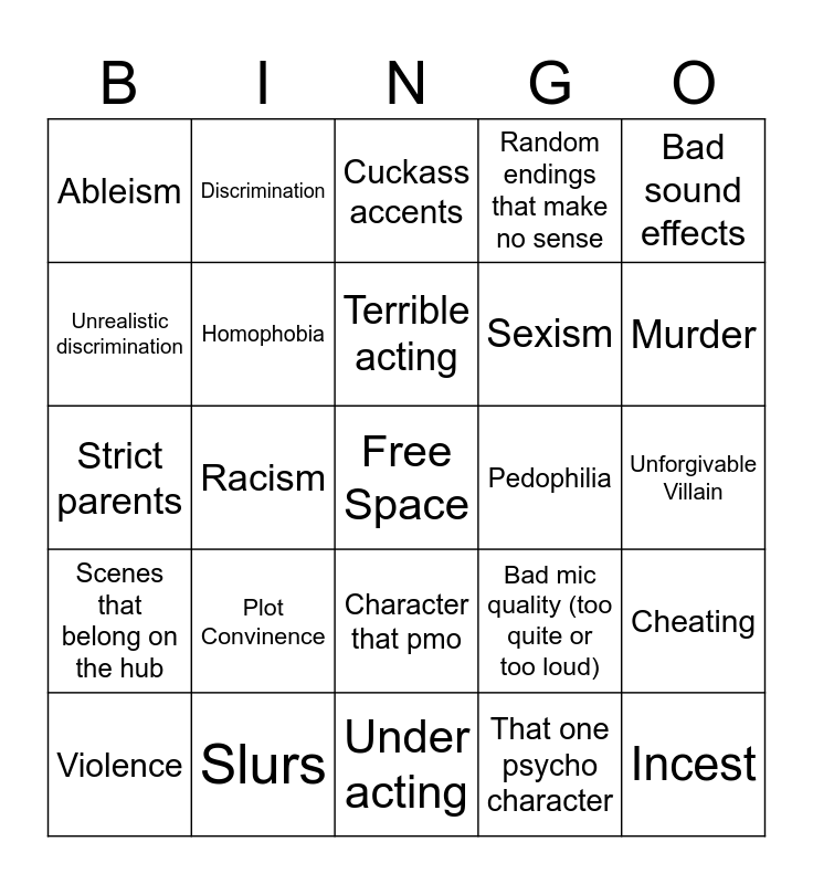 This bingo card has a free space and 24 words: Plot Convinence, Slurs, Terrible acting, Violence, Bad sound effects, Ableism, Unrealistic discrimination, Discrimination, Pedophilia, Character that pmo, Sexism, Strict parents, Bad mic quality (too quite or too loud), Cheating, Homophobia, That one psycho character, Unforgivable Villain, Cuckass accents, Murder, Racism, Incest, Scenes that belong on the hub, Random endings that make no sense and Under acting.