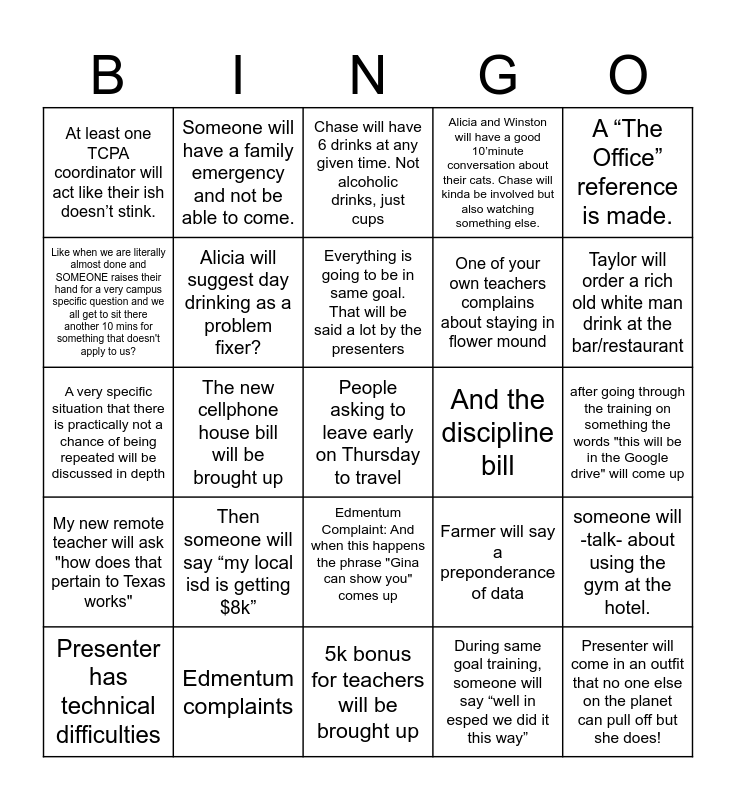 This bingo card has a free space and 24 words: Then someone will say “my local isd is getting $8k”, Edmentum complaints, Everything is going to be in same goal. That will be said a lot by the presenters, Presenter has technical difficulties, A “The Office” reference is made., At least one TCPA coordinator will act like their ish doesn’t stink., Like when we are literally almost done and SOMEONE raises their hand for a very campus specific question and we all get to sit there another 10 mins for something that doesn't apply to us?, Someone will have a family emergency and not be able to come., And the discipline bill, Edmentum Complaint: And when this happens the phrase "Gina can show you" comes up, One of your own teachers complains about staying in flower mound, A very specific situation that there is practically not a chance of being repeated will be discussed in depth, Farmer will say a preponderance of data, someone will -talk- about using the gym at the hotel., Alicia will suggest day drinking as a problem fixer?, During same goal training, someone will say “well in esped we did it this way”, after going through the training on something the words "this will be in the Google drive" will come up, Chase will have 6 drinks at any given time. Not alcoholic drinks, just cups, Taylor will order a rich old white man drink at the bar/restaurant, The new cellphone house bill will be brought up, Presenter will come in an outfit that no one else on the planet can pull off but she does!, My new remote teacher will ask "how does that pertain to Texas works", Alicia and Winston will have a good 10’minute conversation about their cats. Chase will kinda be involved but also watching something else. and 5k bonus for teachers will be brought up.