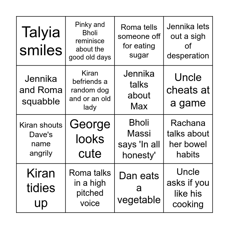 This bingo card has 25 words: Rachana calls Talyia bugs, Bholi Massi offers Dan food more than three times, Bholi Massi says 'In all honesty', Uncle laughs at his own joke, Talyia smiles, Pinky and Bholi reminisce about the good old days, Roma tells someone off for eating sugar, Jennika lets out a sigh of desperation, Kiran shouts Dave's name angrily, George looks cute, Dan eats a vegetable, Rachana talks about her bowel habits, Talyia does something nice for Bholi massi and uncle, Roma talks in a high pitched voice, Jennika talks about Max, Pinky says she misses 'her boy', Kiran tidies up, Kiran befriends a random dog and or an old lady, Uncle sits in the jacuzzi, Uncle asks if you like his cooking, Jennika and Roma squabble, Dave does something cute, Talyia DOESN'T say something sarcastic, Uncle cheats at a game and Someone brings up a family member that isn't present to moan about them.