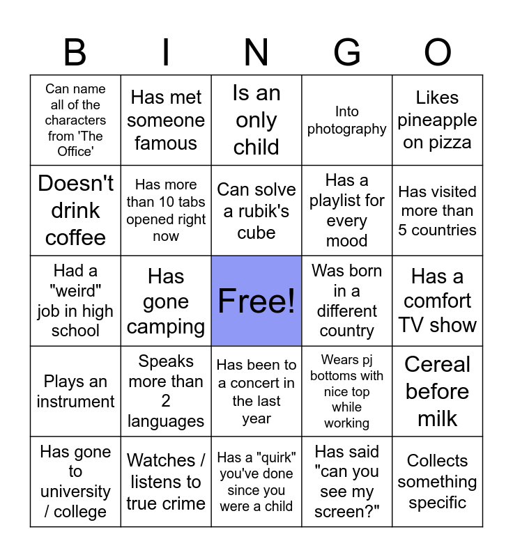 This bingo card has a free space and 24 words: Speaks more than 2 languages, Watches / listens to true crime, Can solve a rubik's cube, Has gone to university / college, Likes pineapple on pizza, Can name all of the characters from 'The Office', Doesn't drink coffee, Has met someone famous, Was born in a different country, Has been to a concert in the last year, Has a playlist for every mood, Had a "weird" job in high school, Wears pj bottoms with nice top while working, Cereal before milk, Has more than 10 tabs opened right now, Has said "can you see my screen?", Has a comfort TV show, Is an only child, Has visited more than 5 countries, Has gone camping, Collects something specific, Plays an instrument, Into photography and Has a "quirk" you've done since you were a child.