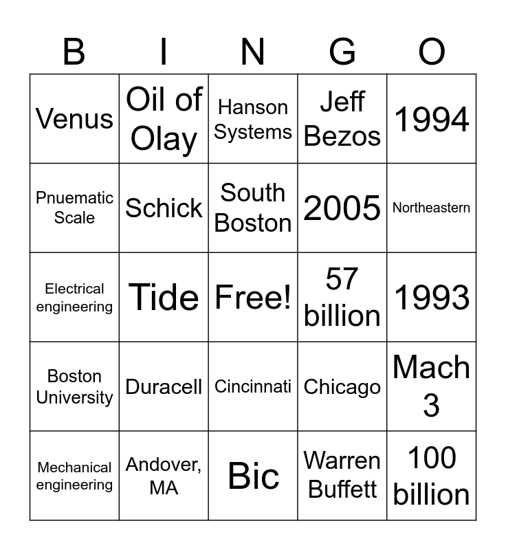 This bingo card has a free space and 24 words: Duracell, Andover, MA, South Boston, Mechanical engineering, 1994, Venus, Pnuematic Scale, Oil of Olay, 57 billion, Cincinnati, 2005, Electrical engineering, Chicago, Mach 3, Schick, Warren Buffett, 1993, Hanson Systems, Northeastern, Tide, 100 billion, Boston University, Jeff Bezos and Bic.