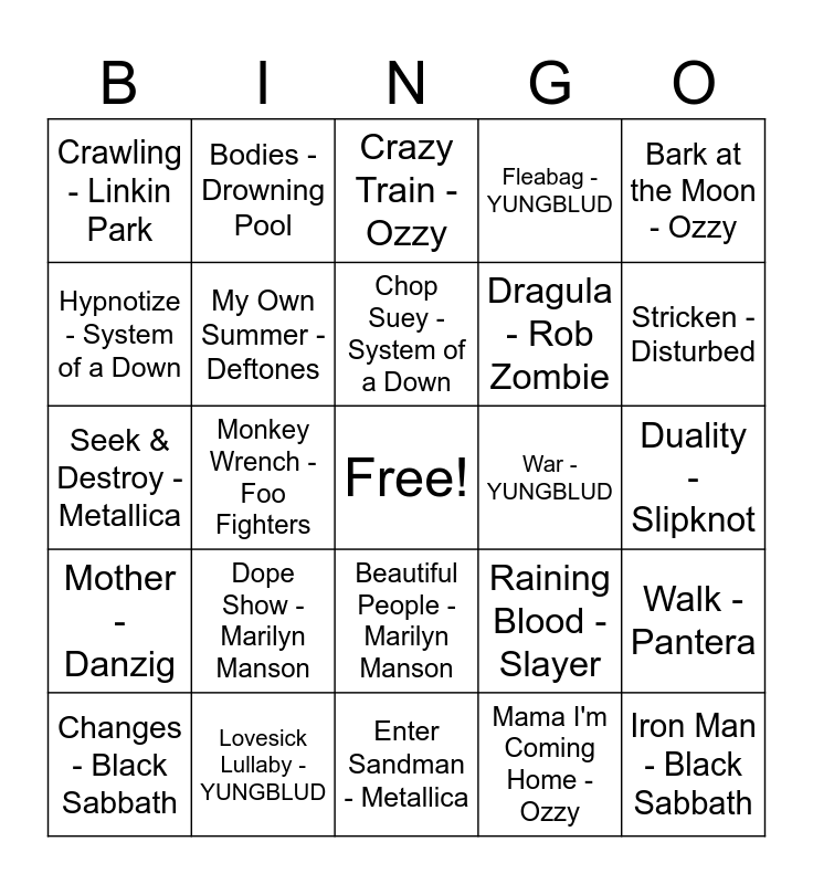 This bingo card has a free space and 43 words: Paranoid - Black Sabbath, Iron Man - Black Sabbath, War Pigs - Black Sabbath, Changes - Black Sabbath, Sweet Leaf - Black Sabbath, Mama I'm Coming Home - Ozzy, Crazy Train - Ozzy, Hellraiser - Ozzy, Bark at the Moon - Ozzy, Lovesick Lullaby - YUNGBLUD, Fleabag - YUNGBLUD, War - YUNGBLUD, Beautiful People - Marilyn Manson, Dope Show - Marilyn Manson, Sweet Dreams - Marilyn Manson, Enter Sandman - Metallica, Master of Puppets - Metallica, Seek & Destroy - Metallica, Down with the Sickness - Disturbed, Stricken - Disturbed, Bodies - Drowning Pool, In the End - Linkin Park, Bleed it Out - Linkin Park, Crawling - Linkin Park, Psychosocial - Slipknot, Duality - Slipknot, Snuff - Slipknot, Angel of Death - Slayer, Raining Blood - Slayer, Mother - Danzig, Twist of Cain - Danzig, Walk - Pantera, All My Life - Foo Fighters, Monkey Wrench - Foo Fighters, Symphony of Destruction - Megadeth, Break Stuff - Limp Bizkit, Ace of Spades - Motorhead, Chop Suey - System of a Down, Hypnotize - System of a Down, Dragula - Rob Zombie, Living Dead Girl - Rob Zombie, My Own Summer - Deftones and Sextape - Deftones.