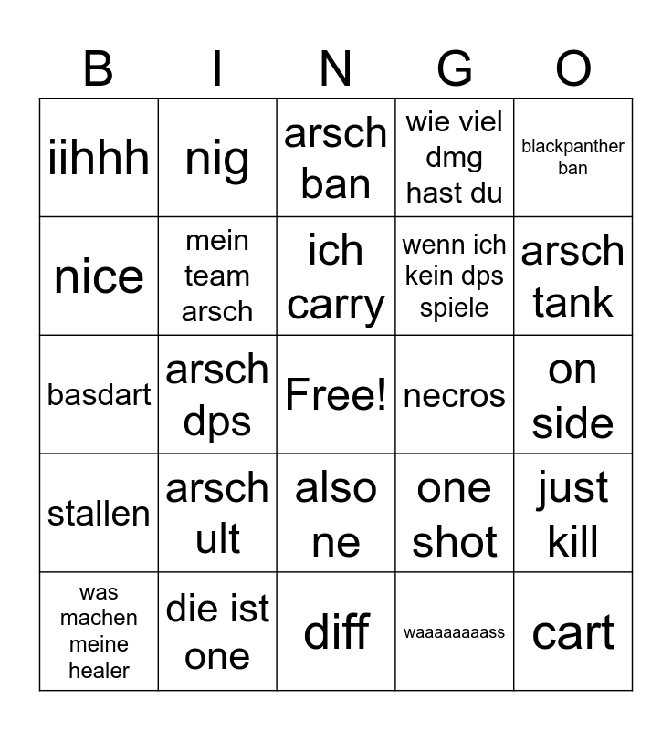 This bingo card has a free space and 24 words: arsch ult, die ist one, ich carry, was machen meine healer, blackpanther ban, iihhh, nice, nig, necros, also ne, wenn ich kein dps spiele, basdart, one shot, just kill, mein team arsch, waaaaaaaass, on side, arsch ban, arsch tank, arsch dps, cart, stallen, wie viel dmg hast du and diff.