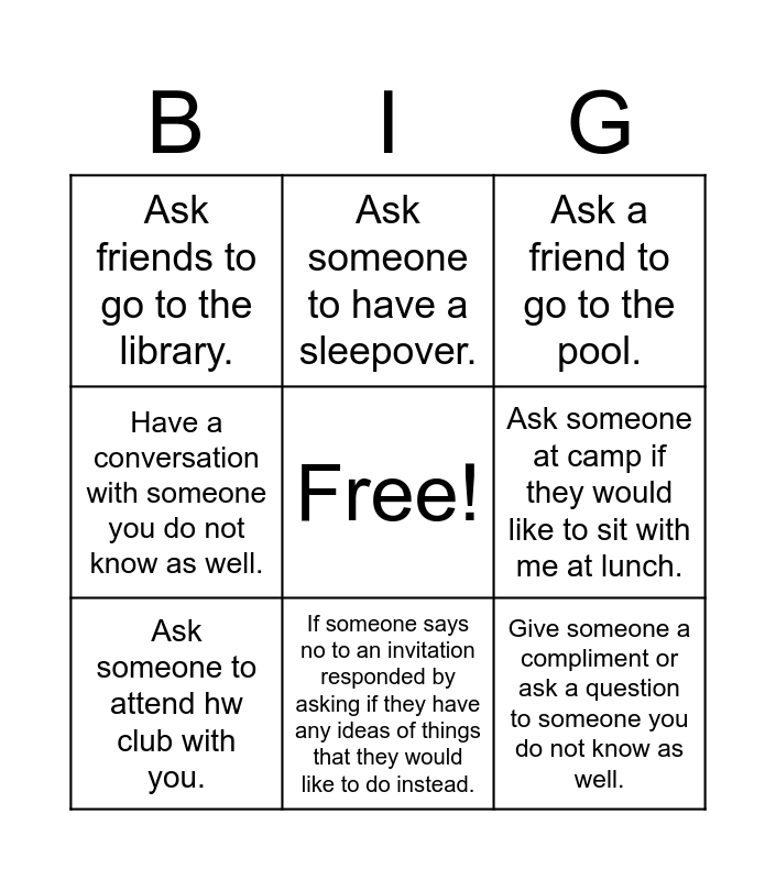 This bingo card has a free space and 8 words: Ask someone at camp if they would like to sit with me at lunch., Ask a friend to go to the pool., Ask someone to have a sleepover., Ask someone to attend hw club with you., Ask friends to go to the library., Give someone a compliment or ask a question to someone you do not know as well., Have a conversation with someone you do not know as well. and If someone says no to an invitation responded by asking if they have any ideas of things that they would like to do instead..