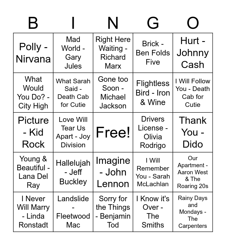 This bingo card has a free space and 46 words: Long Long Time - Linda Ronstadt, Rainy Days and Mondays - The Carpenters, Good Year for the Roses - Elvis Costello, Sorry for the Things - Benjamin Tod, Hallelujah - Jeff Buckley, Hello - Adele, Mad World - Gary Jules, Black - Pearl Jam, What Would You Do? - City High, Sound of Silence - Simon & Garfunkel, What Sarah Said - Death Cab for Cutie, Brick - Ben Folds Five, Our Apartment - Aaron West & The Roaring 20s, I Will Remember You - Sarah McLachlan, My Heart Will Go On - Celine Dion, Wake Me Up .... - Green Day, Gone too Soon - Michael Jackson, Drivers License - Olivia Rodrigo, Everybody Hurts - REM, Hurt - Johnny Cash, Love Will Tear Us Apart - Joy Division, I Know it's Over - The Smiths, Polly - Nirvana, Flightless Bird - Iron & Wine, Today - Smashing Pumpkins, I Will Follow You - Death Cab for Cutie, I Never Will Marry - Linda Ronstadt, Summertime Sadness - Lana Del Ray, Imagine - John Lennon, Young & Beautiful - Lana Del Ray, New American Classic - Taking Back Sunday, No Shade in the Shadow ... - Sufjan Stevens, Linger - The Cranberries, Nothing Compares 2 U - Sinead O'Connor, Forever Young - Alphaville, Landslide - Fleetwood Mac, Thank You - Dido, Time to Say Goodbye - Andrea Bocelli, Angel - Sarah McLaughlin, Time After Time - Cyndi Lauper, Total Eclipse... - Bonnie Tyler, Right Here Waiting - Richard Marx, Picture - Kid Rock, Because of You - Kelly Clarkson, Bad Day - Daniel Powter and Let It Be - The Beatles.
