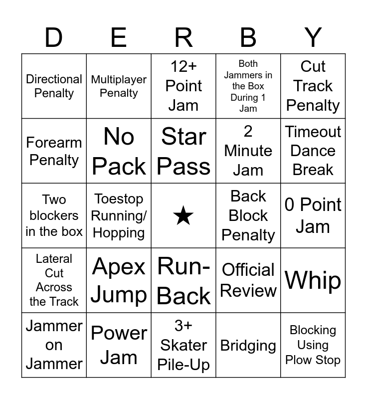 This bingo card has a free space and 24 words: Apex Jump, Power Jam, Star Pass, Jammer on Jammer, Cut Track Penalty, Directional Penalty, Forearm Penalty, Multiplayer Penalty, Back Block Penalty, Run-Back, 2 Minute Jam, Two blockers in the box, Official Review, Whip, No Pack, Bridging, 0 Point Jam, 12+ Point Jam, Timeout Dance Break, Toestop Running/ Hopping, Blocking Using Plow Stop, Lateral Cut Across the Track, Both Jammers in the Box During 1 Jam and 3+ Skater Pile-Up.