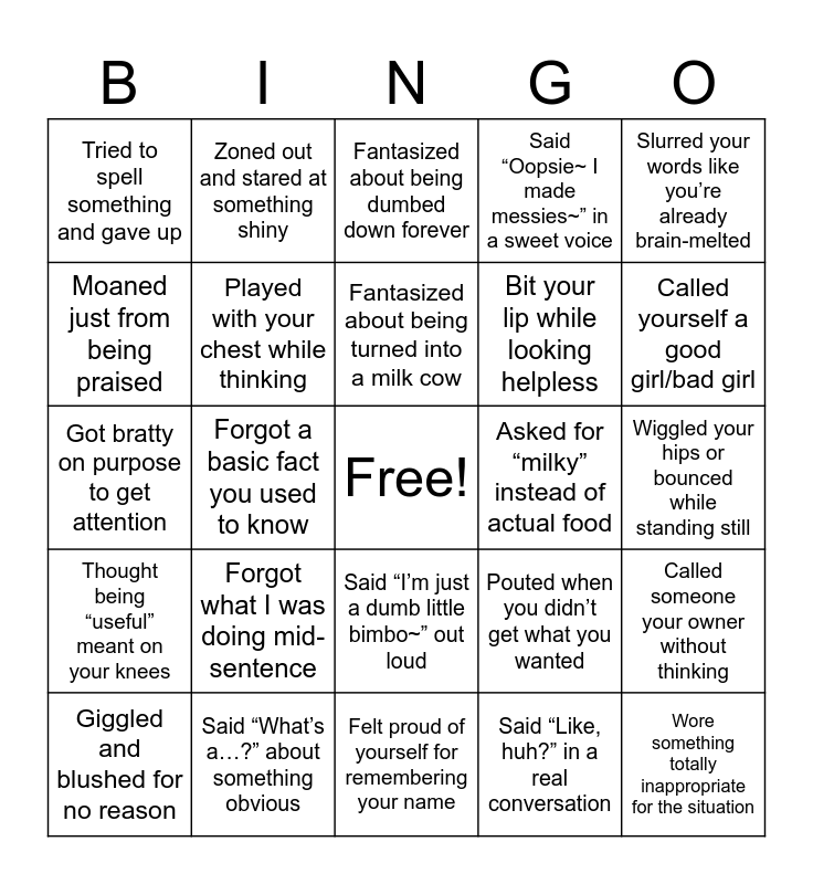This bingo card has a free space and 24 words: Forgot what I was doing mid-sentence, Said “What’s a…?” about something obvious, Fantasized about being turned into a milk cow, Giggled and blushed for no reason, Slurred your words like you’re already brain-melted, Tried to spell something and gave up, Moaned just from being praised, Zoned out and stared at something shiny, Asked for “milky” instead of actual food, Said “I’m just a dumb little bimbo~” out loud, Bit your lip while looking helpless, Got bratty on purpose to get attention, Pouted when you didn’t get what you wanted, Called someone your owner without thinking, Played with your chest while thinking, Said “Like, huh?” in a real conversation, Wiggled your hips or bounced while standing still, Fantasized about being dumbed down forever, Called yourself a good girl/bad girl, Forgot a basic fact you used to know, Wore something totally inappropriate for the situation, Thought being “useful” meant on your knees, Said “Oopsie~ I made messies~” in a sweet voice and Felt proud of yourself for remembering your name.