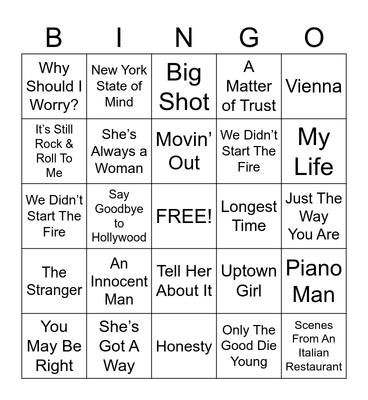 This bingo card has a free space and 24 words: An Innocent Man, She’s Got A Way, Movin’ Out, You May Be Right, Vienna, Why Should I Worry?, It’s Still Rock & Roll To Me, New York State of Mind, Longest Time, Tell Her About It, We Didn’t Start The Fire, We Didn’t Start The Fire, Uptown Girl, Piano Man, She’s Always a Woman, Only The Good Die Young, Just The Way You Are, Big Shot, My Life, Say Goodbye to Hollywood, Scenes From An Italian Restaurant, The Stranger, A Matter of Trust and Honesty.