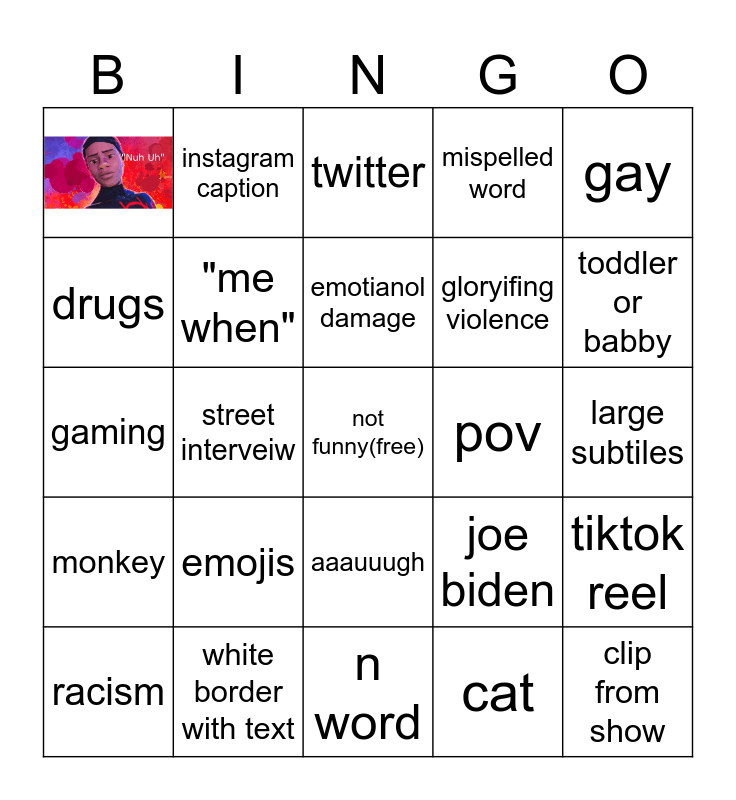 This bingo card has 1 images, a free space and 28 words: racism, sexism, street interveiw, anti lgbtq, twitter, "me when", emojis, pov, white border with text, large subtiles, clip from show, n word, cat, toddler or babby, giga chad stuff, aaauuugh, monkey, gay, gaming, joe biden, text to speech, gloryifing violence, drugs, mispelled word, instagram caption, tiktok reel, emotianol damage and tiktok duet.