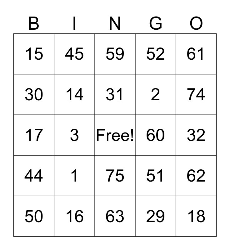 This bingo card has a free space and 24 words: 1, 16, 31, 50, 61, 15, 30, 45, 60, 75, 2, 17, 51, 62, 14, 29, 32, 59, 74, 3, 18, 44, 52 and 63.
