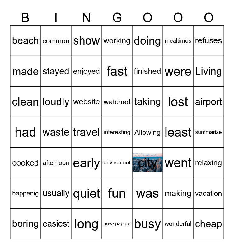 This bingo card has 1 images, a free space and 48 words: was, were, newspapers, waste, website, summarize, common, easiest, mealtimes, environmet, refuses, working, lost, taking, happenig, least, made, Living, making, doing, finished, travel, beach, stayed, vacation, enjoyed, airport, boring, watched, loudly, wonderful, Allowing, relaxing, usually, had, city, went, clean, early, quiet, cooked, cheap, show, long, fast, fun, afternoon and busy.