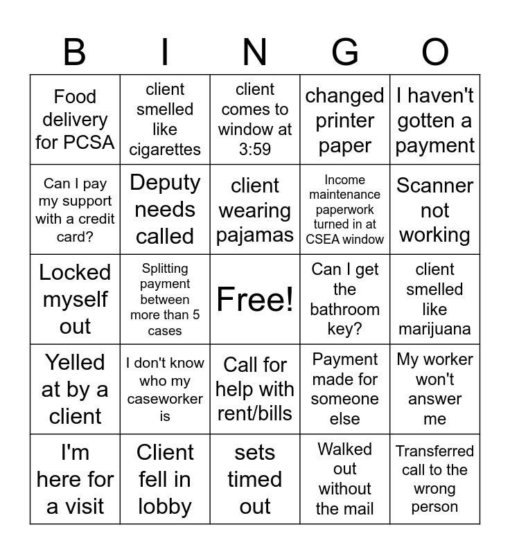 This bingo card has a free space and 24 words: I don't know who my caseworker is, Client fell in lobby, client wearing pajamas, I'm here for a visit, I haven't gotten a payment, Food delivery for PCSA, Can I pay my support with a credit card?, client smelled like cigarettes, Can I get the bathroom key?, Call for help with rent/bills, Income maintenance paperwork turned in at CSEA window, Locked myself out, Payment made for someone else, My worker won't answer me, Deputy needs called, Walked out without the mail, client smelled like marijuana, client comes to window at 3:59, Scanner not working, Splitting payment between more than 5 cases, Transferred call to the wrong person, Yelled at by a client, changed printer paper and sets timed out.