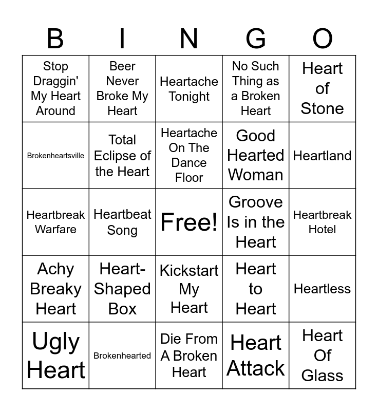 This bingo card has a free space and 42 words: Heart Like A Truck, Heartache On The Dance Floor, Heartbreaker, Heart-Shaped Box, Heart Attack, Heartless, Heart Of Glass, Heart of Gold, Heartache Tonight, Kickstart My Heart, Heartbreak Hotel, Heartland, Heartbeat Song, Heart of Stone, The Heart Of The Matter, Heart to Heart, Heart And Soul, Heartbreak Warfare, Pretty Heart, Beer Never Broke My Heart, Brokenheartsville, Mama's Broken heart, Elastic Heart, Stop Draggin' My Heart Around, Don't Go Breaking My Heart, Tear in My Heart, Good Hearted Woman, Break Your Heart, Even If It Breaks Your Heart, My Heart Will Go On, jar of hearts, Achy Breaky Heart, Total Eclipse of the Heart, Die From A Broken Heart, Listen To Your Heart, Ugly Heart, Brokenhearted, Groove Is in the Heart, Shape of My Heart, I Cross My Heart, No Such Thing as a Broken Heart and Piece of My Heart.