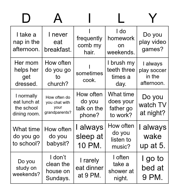 This bingo card has 28 words: I always wake up at 5., What time do you get up?, I brush my teeth three times a day., I often take a shower at night., Her mom helps her get dressed., I frequently comb my hair., I never eat breakfast., What time do you go to school?, What time does your father go to work?, Do you study on weekends?, I normally eat lunch at the school dining room., I do homework on weekends., I don’t clean the house on Sundays., I rarely eat dinner at 9 PM., I always play soccer in the afternoon., I seldom exercise., How often do you babysit?, How often do you go to church?, I sometimes cook., I always sleep at 10 PM., I take a nap in the afternoon., I go to bed at 9 PM., How often do you talk on the phone?, How often do you chat with your grandparents?, Do you watch TV at night?, How often do you listen to music?, Do you play video games? and How often do you read books?.