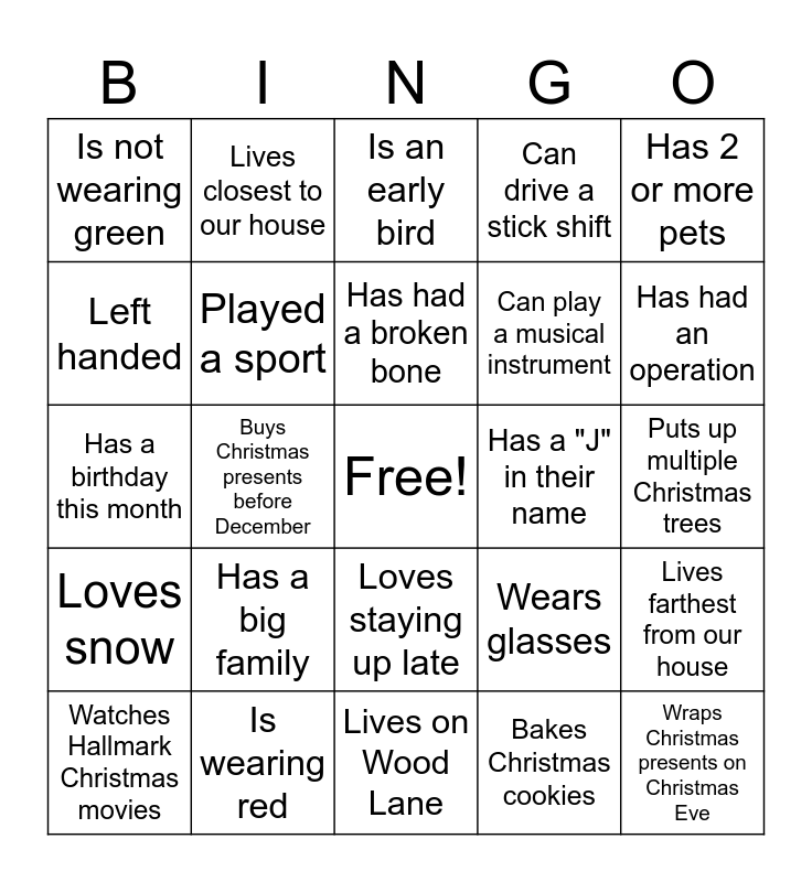 This bingo card has a free space and 24 words: Has a big family, Is wearing red, Has had a broken bone, Watches Hallmark Christmas movies, Has 2 or more pets, Is not wearing green, Left handed, Lives closest to our house, Has a "J" in their name, Loves staying up late, Can play a musical instrument, Has a birthday this month, Wears glasses, Lives farthest from our house, Played a sport, Bakes Christmas cookies, Puts up multiple Christmas trees, Is an early bird, Has had an operation, Buys Christmas presents before December, Wraps Christmas presents on Christmas Eve, Loves snow, Can drive a stick shift and Lives on Wood Lane.