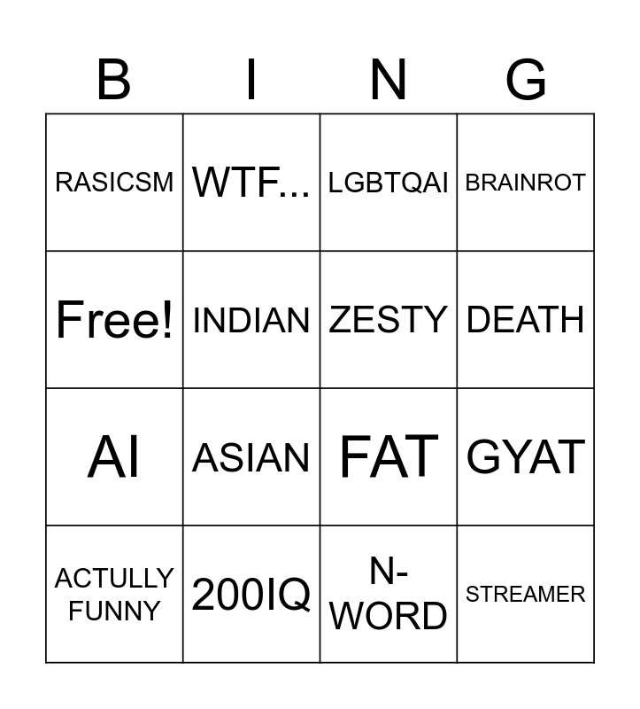 This bingo card has 16 words: 200IQ, GYAT, LGBTQAI, RASICSM, AI, WTF..., FAT, N-WORD, Free!, INDIAN, ACTULLY FUNNY, BRAINROT, ASIAN, DEATH, ZESTY and STREAMER.