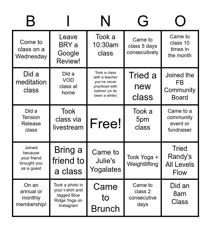 This bingo card has a free space and 24 words: Bring a friend to a class, Took a photo in your t-shirt and tagged Blue Ridge Yoga on Instagram, Took a class with a teacher you’ve never practiced with before! (or its been a while), On an annual or monthly membership!, Came to class 10 times in the month, Come to class on a Wednesday, Did a meditation class, Leave BRY a Google Review!, Took a 5pm class, Came to Julie's Yogalates, Tried a new class, Did a Tension Release class, Took Yoga + Weightlifting, Tried Randy's All Levels Flow, Did a VOD class at home, Came to class 2 consecutive days, Came to a community event or fundraiser, Took a 10:30am class, Joined the FB Community Board, Took class via livestream, Did an 8am Class, Joined because your friend brought you as a guest, Came to class 5 days consecutively and Came to Brunch.