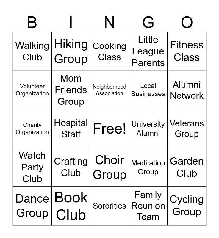 This bingo card has a free space and 60 words: Church Group, Book Club, Running Club, Watch Party Club, Family Reunion Team, Yoga Enthusiasts, Mom Friends Group, Dad Friends Group, Local Businesses, Teachers Group, Little League Parents, School PTA, Volunteer Organization, Sports Team, Art Society, Walking Club, Cycling Group, Fitness Class, LGBTQ+ Allies, Neighborhood Association, University Alumni, Cooking Class, Dance Group, Garden Club, Local Band, Photography Group, Dog Owners Group, Environmental Club, Alumni Network, Scouts Troop, Community Theater, Car Enthusiasts, Chess Club, Parent Support Group, Hiking Group, Local Fire Department, Police Department Team, Hospital Staff, Library Staff, Charity Organization, Local Government Office, Crafting Club, Veterans Group, Senior Center Group, Meditation Group, Language Club, Cultural Association, TCC Clinics, Farmers Market Vendors, Choir Group, Sororities, Fraternities, Cheer Team, Foodie Tasting Group, Adoption Support Group, Survivor Advocacy Group, Foster Parent Circle, Veteran Support Group, Lions Club and City Council Staff.