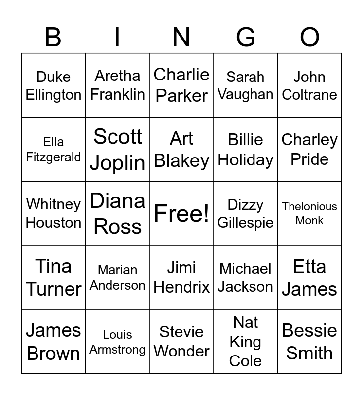 This bingo card has a free space and 24 words: Marian Anderson, Louis Armstrong, Art Blakey, James Brown, John Coltrane, Duke Ellington, Ella Fitzgerald, Aretha Franklin, Dizzy Gillespie, Jimi Hendrix, Billie Holiday, Whitney Houston, Michael Jackson, Etta James, Scott Joplin, Nat King Cole, Thelonious Monk, Charlie Parker, Charley Pride, Diana Ross, Bessie Smith, Tina Turner, Sarah Vaughan and Stevie Wonder.