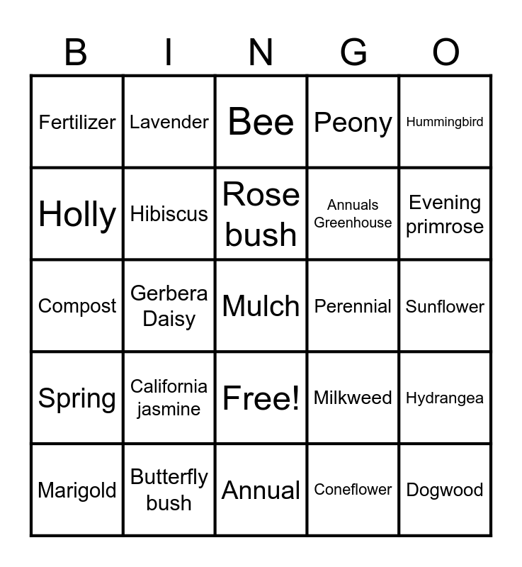 This bingo card has 26 words: Free!, Coneflower, Rose bush, Butterfly bush, Hummingbird, Fertilizer, Holly, Lavender, Sunflower, Milkweed, Annuals Greenhouse, Compost, Hydrangea, Marigold, Gerbera Daisy, Chrysanthemum (Mums), Peony, Spring, Bee, Mulch, Evening primrose, Annual, Perennial, California jasmine, Hibiscus and Dogwood.