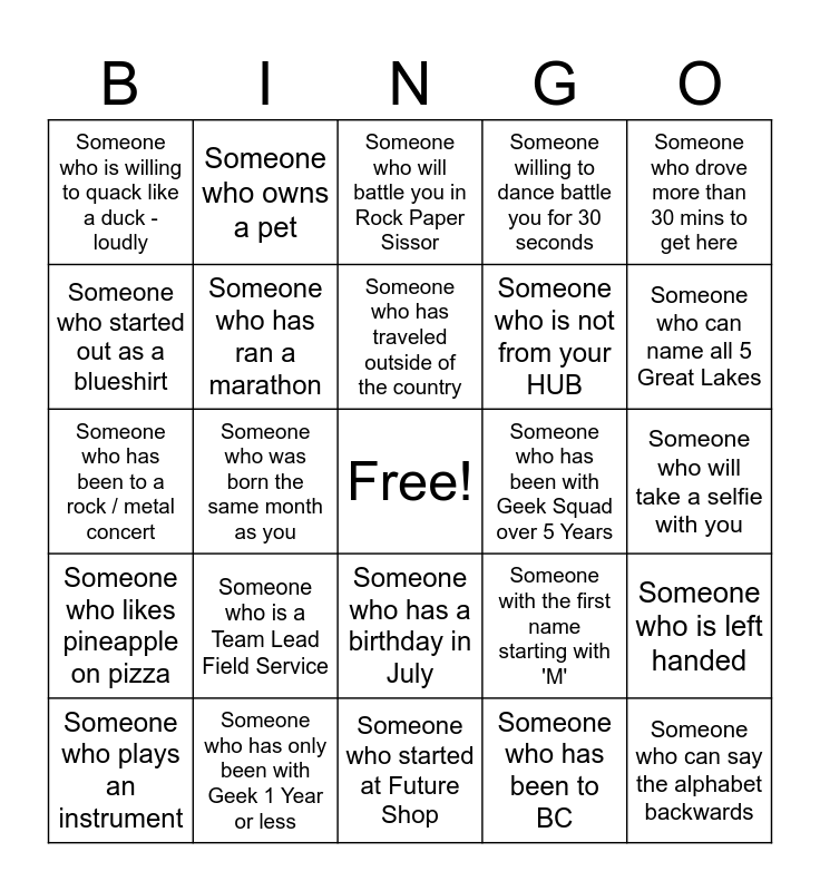 This bingo card has a free space and 39 words: Someone who has jumped out of an airplane, Someone who is wearing a hat, Someone who can whistle, Someone who has ran a marathon, Someone who plays an instrument, Someone who has a birthday in July, Someone who has traveled outside of the country, Someone who has a tattoo, Someone who drove more than 30 mins to get here, Someone who likes pineapple on pizza, Someone who was born the same month as you, Someone willing to dance battle you for 30 seconds, Someone who can say the alphabet backwards, Someone who will take a selfie with you, Someone who has been with Geek Squad over 5 Years, Someone who is a Team Lead Field Service, Take a sticker from someone you've never spoken to, Someone who is willing to quack like a duck - loudly, Someone born after the year 2000, Someone with the first name starting with 'M', Someone who started out as a blueshirt, Someone who started at Future Shop, Someone who is not from your HUB, Someone who can name all 5 Great Lakes, Someone who knows a fact about outer space, Someone who is the youngest in their family, Someone who has read all the Harry Potter books, Someone who likes spicy food, Someone who can speak 2 or more languages, Someone who owns a pet, Someone who is a morning person, Someone who loves video games, Someone who will battle you in Rock Paper Sissor, Someone who has only been with Geek 1 Year or less, Someone who has been to BC, Someone who has kids, Someone who is left handed, Someone who has been to a rock / metal concert and Someone who forgot to bring their badge with them.
