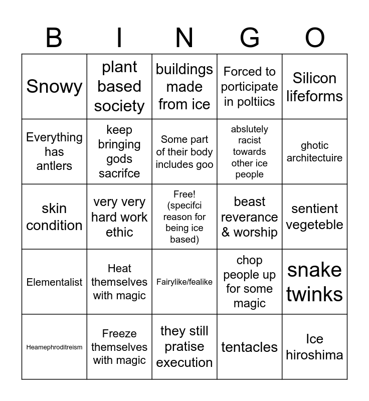 This bingo card has a free space and 24 words: Heat themselves with magic, Freeze themselves with magic, Some part of their body includes goo, Heamephroditreism, Silicon lifeforms, Snowy, Everything has antlers, plant based society, beast reverance & worship, Fairylike/fealike, abslutely racist towards other ice people, skin condition, chop people up for some magic, snake twinks, keep bringing gods sacrifce, tentacles, sentient vegeteble, buildings made from ice, ghotic architectuire, very very hard work ethic, Ice hiroshima, Elementalist, Forced to porticipate in poltiics and they still pratise execution.