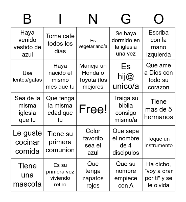 This bingo card has a free space and 24 words: Tiene su primera comunion, Es su primera vez viviendo retiro, Maneja un Honda o Toyota (los mejores, Tiene una mascota, Escriba con la mano izquierda, Haya venido vestido de azul, Use lentes/gafas, Toma cafe todos los dias, Traiga su biblia consigo mismo/a, Color favorito sea el azul, Es hij@ unico/a, Sea de la misma iglesia que tu, Que sepa el nombre de 4 discipulos, Toque un instrumento, Haya nacido el mismo mes que tu, Que su nombre empiece con A, Tiene mas de 5 hermanos, Es vegetariano/a, Que ame a Dios con todo su corazon, Que tenga la misma edad que tu, Ha dicho, "voy a orar por ti" y se le olvida, Le guste cocinar comida, Se haya dormido en la iglesia una vez and Que tenga zapatos rojos.