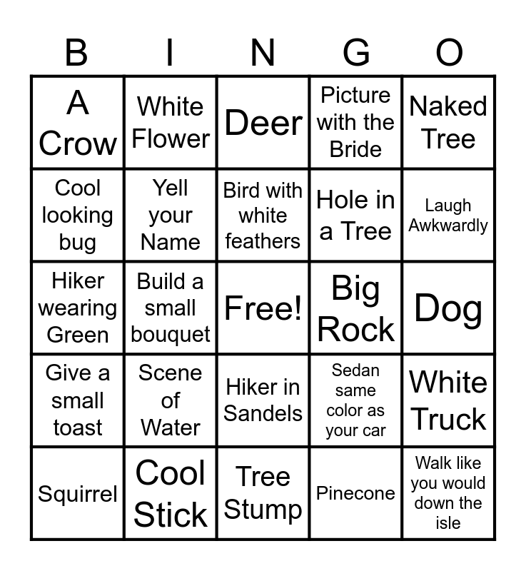 This bingo card has a free space and 24 words: Scene of Water, Cool Stick, Bird with white feathers, Squirrel, Naked Tree, A Crow, Cool looking bug, White Flower, Big Rock, Hiker in Sandels, Hole in a Tree, Hiker wearing Green, Sedan same color as your car, White Truck, Yell your Name, Pinecone, Dog, Deer, Laugh Awkwardly, Build a small bouquet, Walk like you would down the isle, Give a small toast, Picture with the Bride and Tree Stump.