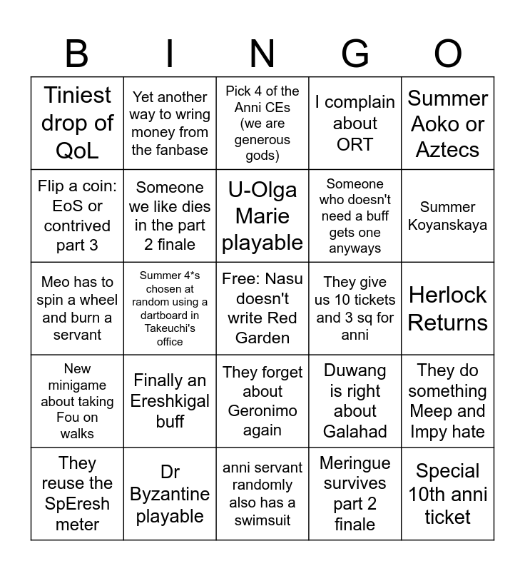 This bingo card has a free space and 24 words: Finally an Ereshkigal buff, Dr Byzantine playable, U-Olga Marie playable, They reuse the SpEresh meter, Summer Aoko or Aztecs, Tiniest drop of QoL, Flip a coin: EoS or contrived part 3, Yet another way to wring money from the fanbase, They give us 10 tickets and 3 sq for anni, They forget about Geronimo again, Someone who doesn't need a buff gets one anyways, Meo has to spin a wheel and burn a servant, Duwang is right about Galahad, They do something Meep and Impy hate, Someone we like dies in the part 2 finale, Meringue survives part 2 finale, Herlock Returns, Pick 4 of the Anni CEs (we are generous gods), Summer Koyanskaya, Summer 4*s chosen at random using a dartboard in Takeuchi's office, Special 10th anni ticket, New minigame about taking Fou on walks, I complain about ORT and anni servant randomly also has a swimsuit.