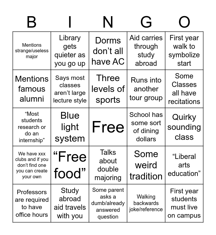 This bingo card has a free space and 24 words: “Free food”, Study abroad aid travels with you, Three levels of sports, Professors are required to have office hours, First year walk to symbolize start, Mentions strange/useless major, Mentions famous alumni, Library gets quieter as you go up, School has some sort of dining dollars, Talks about double majoring, Runs into another tour group, “Most students research or do an internship”, Some weird tradition, “Liberal arts education”, Says most classes aren’t large lecture style, Walking backwards joke/reference, Quirky sounding class, Dorms don’t all have AC, Some Classes all have recitations, Blue light system, First year students must live on campus, We have xxx clubs and if you don’t find one you can create your own, Aid carries through study abroad and Some parent asks a dumb/already answered question.