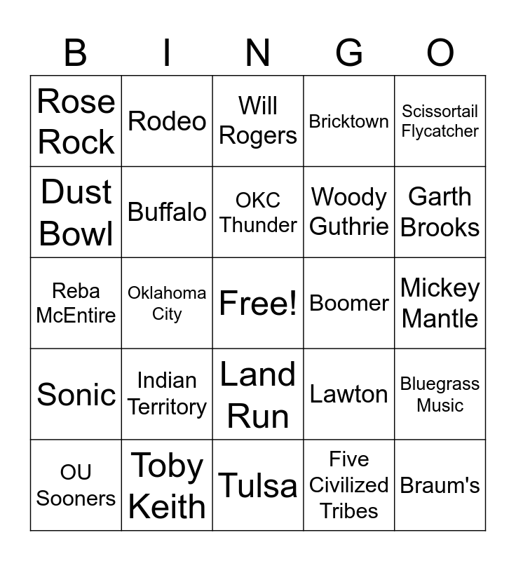 This bingo card has a free space and 30 words: OU Sooners, OSU Cowboys, OKC Thunder, Red River, Scissortail Flycatcher, Rose Rock, Rodeo, Land Run, Boomer, Braum's, Sonic, Buffalo, Horses, Five Civilized Tribes, Bluegrass Music, Square Dance, Oklahoma City, Tulsa, Lawton, Garth Brooks, Reba McEntire, Toby Keith, Will Rogers, Woody Guthrie, Mickey Mantle, Dust Bowl, Indian Territory, Moore, Bricktown and Myriad Gardens.