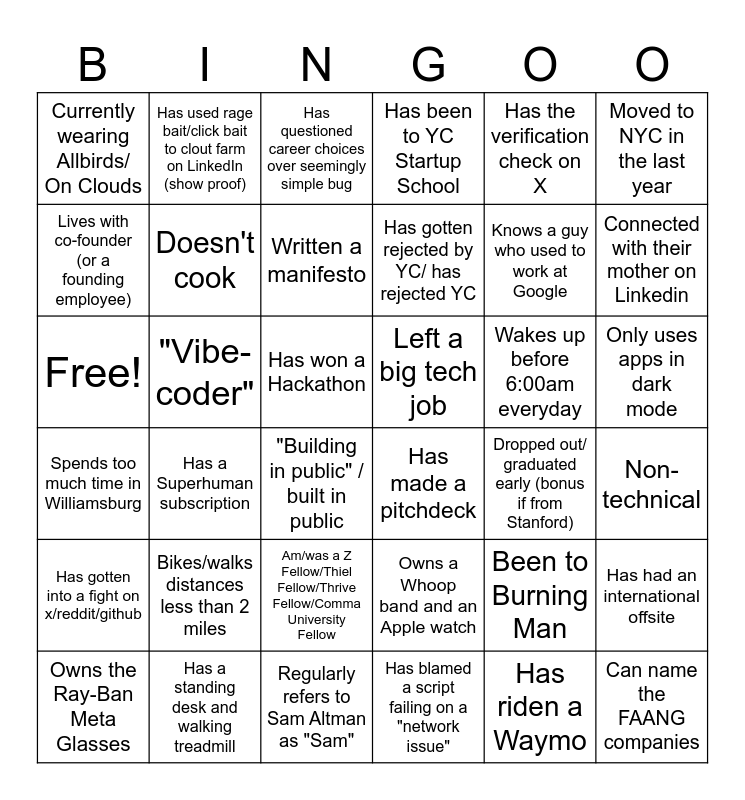 This bingo card has 36 words: Owns a Whoop band and an Apple watch, Am/was a Z Fellow/Thiel Fellow/Thrive Fellow/Comma University Fellow, Has blamed a script failing on a "network issue", Lives with co-founder (or a founding employee), Spends too much time in Williamsburg, Left a big tech job, Doesn't cook, Regularly refers to Sam Altman as "Sam", Has the verification check on X, Been to Burning Man, Connected with their mother on Linkedin, Has been to YC Startup School, Has had an international offsite, "Vibe-coder", Has gotten rejected by YC/ has rejected YC, Currently wearing Allbirds/ On Clouds, Has gotten into a fight on x/reddit/github, Wakes up before 6:00am everyday, Free!, Has questioned career choices over seemingly simple bug, Has won a Hackathon, Has a Superhuman subscription, Has made a pitchdeck, "Building in public" / built in public, Dropped out/ graduated early (bonus if from Stanford), Has used rage bait/click bait to clout farm on LinkedIn (show proof), Knows a guy who used to work at Google, Has a standing desk and walking treadmill, Written a manifesto, Moved to NYC in the last year, Can name the FAANG companies, Owns the Ray-Ban Meta Glasses, Non-technical, Only uses apps in dark mode, Bikes/walks distances less than 2 miles and Has riden a Waymo.