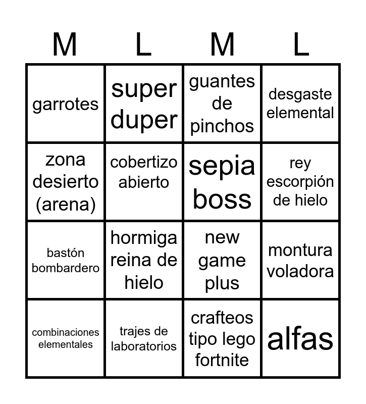 This bingo card has 16 words: trajes de laboratorios, montura voladora, guantes de pinchos, garrotes, bastón bombardero, super duper, new game plus, crafteos tipo lego fortnite, zona desierto (arena), cobertizo abierto, combinaciones elementales, desgaste elemental, hormiga reina de hielo, rey escorpión de hielo, sepia boss and alfas.