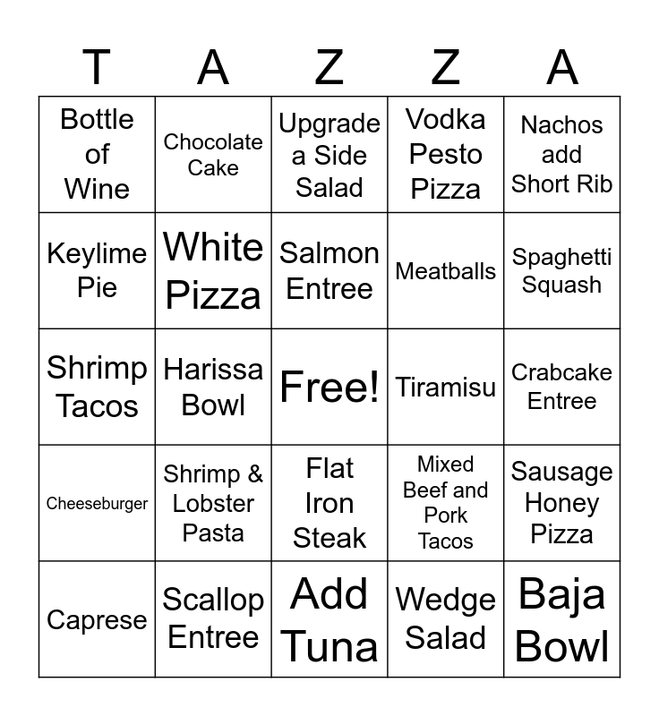 This bingo card has a free space and 24 words: Shrimp & Lobster Pasta, Scallop Entree, Salmon Entree, Caprese, Nachos add Short Rib, Bottle of Wine, Keylime Pie, Chocolate Cake, Tiramisu, Flat Iron Steak, Meatballs, Shrimp Tacos, Mixed Beef and Pork Tacos, Sausage Honey Pizza, White Pizza, Wedge Salad, Crabcake Entree, Upgrade a Side Salad, Spaghetti Squash, Harissa Bowl, Baja Bowl, Cheeseburger, Vodka Pesto Pizza and Add Tuna.