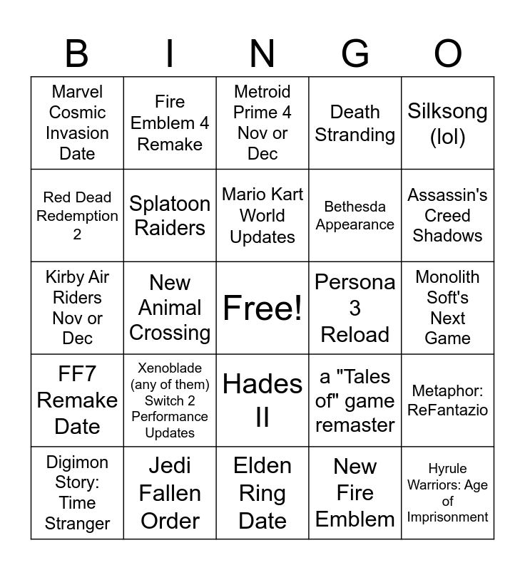 This bingo card has a free space and 24 words: Xenoblade (any of them) Switch 2 Performance Updates, Jedi Fallen Order, Mario Kart World Updates, Digimon Story: Time Stranger, Silksong (lol), Marvel Cosmic Invasion Date, Red Dead Redemption 2, Fire Emblem 4 Remake, Persona 3 Reload, Hades II, Bethesda Appearance, Kirby Air Riders Nov or Dec, a "Tales of" game remaster, Metaphor: ReFantazio, Splatoon Raiders, New Fire Emblem, Monolith Soft's Next Game, Metroid Prime 4 Nov or Dec, Assassin's Creed Shadows, New Animal Crossing, Hyrule Warriors: Age of Imprisonment, FF7 Remake Date, Death Stranding and Elden Ring Date.