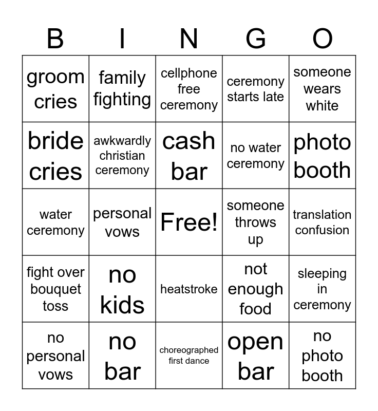 This bingo card has a free space and 26 words: heatstroke, open bar, cash bar, no bar, someone wears white, groom cries, bride cries, family fighting, translation confusion, not enough food, no water ceremony, water ceremony, sleeping in ceremony, no personal vows, personal vows, couple late to reception, ceremony starts late, fight over bouquet toss, cellphone free ceremony, no photo booth, photo booth, choreographed first dance, someone throws up, no kids, awkwardly christian ceremony and no abalone.