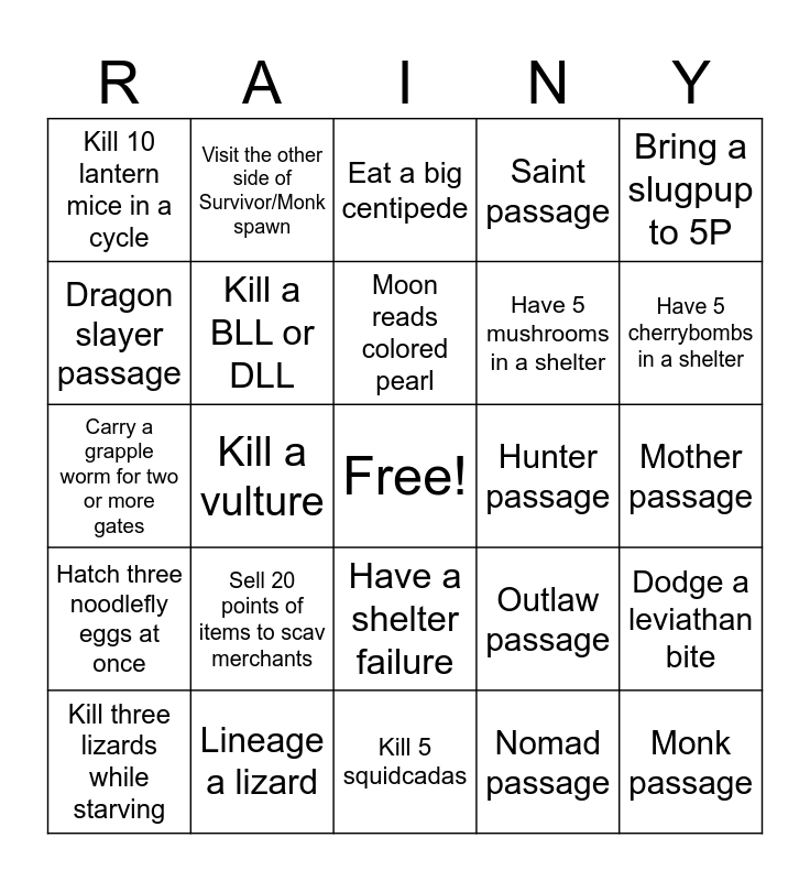 This bingo card has a free space and 39 words: Dont die or starve for 10 cycles straight, Kill five pole plants in two cycles, Meet three echos, Kill a BLL or DLL, Kill three lizards while starving, Have a shelter failure, Moon reads colored pearl, Get bit by something and live, Bring a slugpup to 5P, Hatch three noodlefly eggs at once, Kill a vulture, Saint passage, Monk passage, Mother passage, Hunter passage, Sell 20 points of items to scav merchants, Steal an item from a scav without hurting them, Kill 10 lantern mice in a cycle, Friend passage, Outlaw passage, Dragon slayer passage, Kill 5 squidcadas, Have 5 mushrooms in a shelter, Have 5 cherrybombs in a shelter, Have 5 sporepuffs in a shelter, Have 5 flashbangs in a shelter, Bring a slugpup to LTTM, 15 kills in one cycle, Chieftain passage, Visit the other side of Survivor/Monk spawn, Get a slugpup to kill any enemy, Kill an enemy with a rock, Eat a big centipede, Lineage a lizard, Nomad passage, Kill a miros bird, Dodge a leviathan bite, Carry a grapple worm for two or more gates and Bring LTTM a neuron.