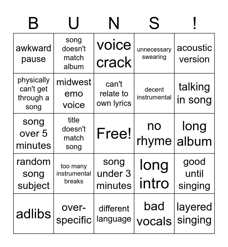 This bingo card has a free space and 32 words: bad vocals, changes song style, title doesn't match song, random/bad album cover, random song subject, midwest emo voice, acoustic version, good until singing, song doesn't match album, lyrics make no sense, can't relate to own lyrics, voice crack, weird riff, bad flow, no rhyme, cornball, adlibs, song over 5 minutes, song under 3 minutes, too many instrumental breaks, long intro, incoherent, long album, over-specific, layered singing, unnecessary swearing, decent instrumental, physically can't get through a song, awkward pause, different language, "hey"/"123" and talking in song.