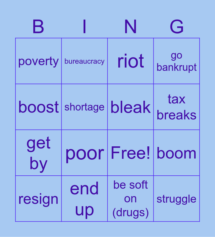 This bingo card has 21 words: end up, make a difference, bureaucracy, in recession, be soft on (drugs), bleak, poverty, riot, Free!, tax breaks, get by, go bankrupt, struggle, shortage of, shortage, be assaulted, resign, poor, boost, boom and sleep rough.
