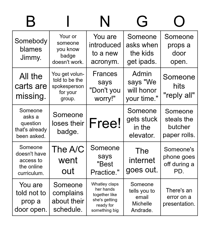 This bingo card has a free space and 25 words: The A/C went out, Whatley claps her hands together like she's getting ready for something big, Frances says "Don't you worry!", You are told not to prop a door open., Someone props a door open., Somebody blames Jimmy., All the carts are missing., Your or someone you know badge doesn't work., Someone gets stuck in the elevator., Someone says "Best Practice.", Admin says "We will honor your time.", Someone asks a question that's already been asked., The internet goes out., Someone's phone goes off during a PD., You get volun-told to be the spokesperson for your group., The printer breaks/runs out of toner., Someone steals the butcher paper rolls., You are introduced to a new acronym., Someone hits "reply all", Someone loses their badge., There's an error on a presentation., Someone complains about their schedule., Someone doesn't have access to the online curriculum., Someone asks when the kids get ipads. and Someone tells you to email Michelle Andrade..