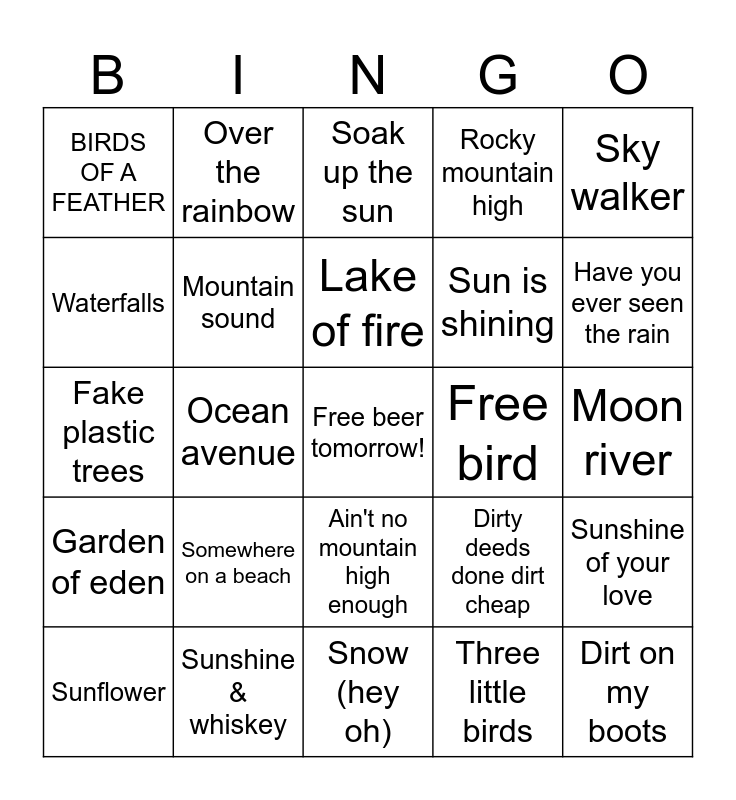 This bingo card has a free space and 35 words: Every rose has its thorn, Where the green grass grows, Mountain music, Mountain sound, Ain't no mountain high enough, Rocky mountain high, Waterfalls, Flowers, Lake of fire, River, Fake plastic trees, Sky walker, Skyfall, A sky full of stars, BIRDS OF A FEATHER, Free bird, Three little birds, Ocean avenue, Garden of eden, Dirt on my boots, Dirty deeds done dirt cheap, Sunflower, Sunshine of your love, Sunshine & whiskey, Soak up the sun, Have you ever seen the rain, Red dirt road, Texas sun, Sun is shining, Moon river, Neon moon, Snow (hey oh), Somewhere on a beach, Over the rainbow and Green river.