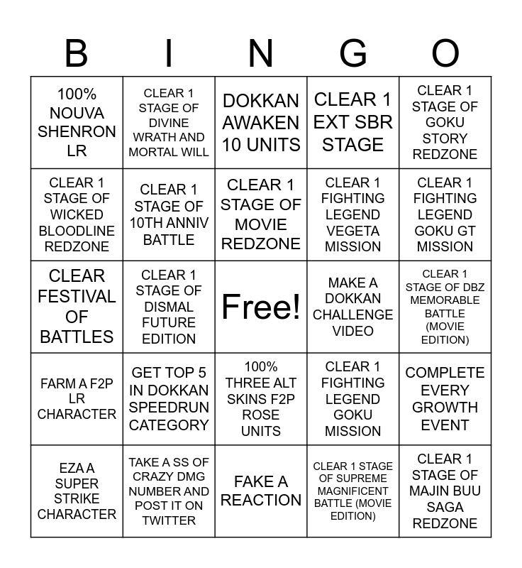 This bingo card has a free space and 76 words: DOKKAN AWAKEN 1 UNIT, DOKKAN AWAKEN 5 UNITS, DOKKAN AWAKEN 10 UNITS, DOKKAN AWAKEN 15 UNITS, EZA 3 UNITS, EZA 5 UNITS, SUPER EZA 1 UNIT, MAX LINK LEVEL 1 UNIT, DO A MULTI, CLEAR PERFECT COOPERATION TEAM BATTLE, CLEAR STAGE 1 OF SERIOUSLY SERIOUS ALL OUT BATTLES, CLEAR 1 STAGE OF GT REDZONE, CLEAR 1 STAGE OF MOVIE REDZONE, CLEAR 1 STAGE OF WICKED BLOODLINE REDZONE, CLEAR 1 STAGE OF RED RIBBON ARMY REDZONE, CLEAR 1 STAGE OF DISMAL FUTURE EDITION, CLEAR 1 STAGE OF MOVIE REDZONE 2, CLEAR 1 STAGE OF MAJIN BUU SAGA REDZONE, CLEAR 1 STAGE OF VEGETA STORY REDZONE, CLEAR 1 STAGE OF GOKU STORY REDZONE, CLEAR 1 STAGE OF DB SAGA REDZONE, CLEAR FESTIVAL OF BATTLES, CLEAR 1 STAGE OF 10TH ANNIV BATTLE, CLEAR 1 STAGE OF DIVINE WRATH AND MORTAL WILL, CLEAR 1 EXT SBR STAGE, CLEAR 3 EXT SBR STAGES, CLEAR 5 EXT SBR STAGES, CLEAR 1 SBR STAGE, CLEAR 3 SBR STAGES, CLEAR 5 SBR STAGES, CLEAR 1 STAGE OF DBS MEMORABLE BATTLE MOVIE EDITION, CLEAR ALL STAGES OF DBS MEMORABLE BATTLE MOVIE EDITION, CLEAR 1 FIGHTING LEGEND FRIEZA MISSION, CLEAR 1 FIGHTING LEGEND GOKU MISSION, CLEAR 1 FIGHTING LEGEND GOKU GT MISSION, CLEAR 1 FIGHTING LEGEND VEGETA MISSION, CLEAR 1 STAGE OF SUPREME MAGNIFICENT BATTLE (DBS EDITION), CLEAR 1 STAGE OF SUPREME MAGNIFICENT BATTLE (USS EDITION), CLEAR 1 STAGE OF DBZ MEMORABLE BATTLE (MOVIE EDITION), CLEAR 1 STAGE OF SUPREME MAGNIFICENT BATTLE (MOVIE EDITION), CLEAR 1 STAGE OF SUPREME MAGNIFICENT BATTLE (SUPER WARRIORS EDITION), CLEAR 1 STAGE OF TREMBLE WITH FEAR, CLEAR 1 STAGE OF BATTLE HARDENED FORMIDABLE FOES, GET A KO SCREEN, CLEAR A STORY EVENT, 100% A SUPER STRIKE CHARACTER, EZA A SUPER STRIKE CHARACTER, 100% NOUVA SHENRON LR, 100% ONE F2P ROSE UNIT, 100% ONE ALT SKIN F2P ROSE UNIT, 100% THREE F2P ROSE UNITS, 100% THREE ALT SKINS F2P ROSE UNITS, 100% ALL ROSE F2P UNITS, 100% ALL ALT SKIN ROSE UNITS, PULL LR SSJ4 GOGETA, PULL LR OMEGA SHENRON, PULL LR SSB GOKU AND VEGETA (and trunks), PULL LR ROSE AND ZAMASU, CLEAR ALL GLOBAL CAMPAIGN SPECIAL BATTLE STAGES, CLEAR UNIVERSE-DISTORTING JUSTICE AND ORDER, GET TOP 5 IN DOKKAN SPEEDRUN CATEGORY, DO A SUMMON VIDEO, RAINBOW ANY UNIT, SET UP A DOMAIN, FARM ALL SUPER STRIKES, COMPLETE DAIMA STORY EVENT, MAKE A DOKKAN CHALLENGE VIDEO, DO A SHOWCASE ON ANY UNIT, FARM AURA HYPE MOMENTS CLIP, SPEEDRUN DOKKAN HOT TAKES FOR A MINUTE, COMPLETE EVERY GROWTH EVENT, FARM A F2P LR CHARACTER, TAKE A SS OF CRAZY DMG NUMBER AND POST IT ON TWITTER, CLEAR A STAGE WHILE COMMENTATING AS IF YOU’RE AT EVO, FAKE A REACTION and PLAY STANDING UP (work out fatty).