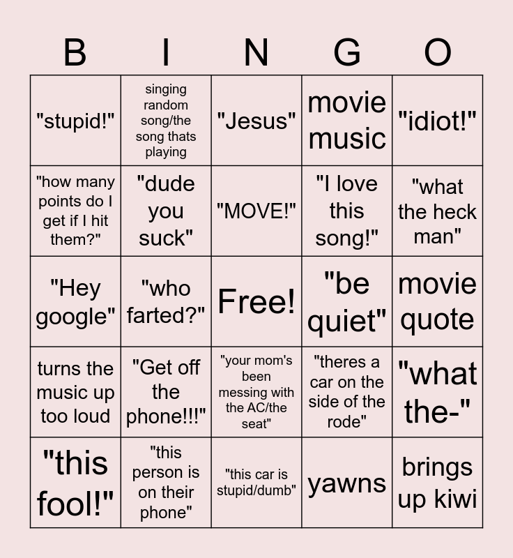 This bingo card has a free space and 24 words: "Get off the phone!!!", "this person is on their phone", "MOVE!", "this fool!", "idiot!", "stupid!", "how many points do I get if I hit them?", singing random song/the song thats playing, "be quiet", "your mom's been messing with the AC/the seat", "I love this song!", "Hey google", "theres a car on the side of the rode", "what the-", "dude you suck", yawns, movie quote, "Jesus", "what the heck man", "who farted?", brings up kiwi, turns the music up too loud, movie music and "this car is stupid/dumb".