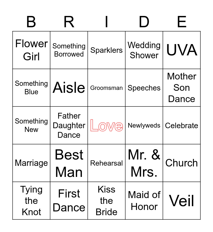 This bingo card has a free space and 42 words: Dress, Groomsman, Vows, Best Man, Maid of Honor, Church, Veil, Groom, Sparklers, Rehearsal, Celebrate, Mother Son Dance, Father Daughter Dance, UVA, Toasts, Mr. & Mrs., Wife, Something New, Something Old, Something Borrowed, Something Blue, Getaway Car, I Do, Flower Girl, Ring Bearer, Cake, Speeches, Rings, Officiant, Bouquet, JMU, Marriage, Aisle, Kiss the Bride, Bridesmaid, Tying the Knot, First Dance, Newlyweds, Honeymoon, Husband, Wedding Shower and Family.