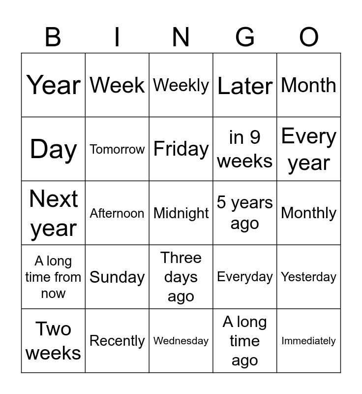 This bingo card has 25 words: Sunday, Wednesday, Friday, Two weeks, Month, Year, Day, Week, 5 years ago, Three days ago, in 9 weeks, Next year, Everyday, Yesterday, Tomorrow, Immediately, Monthly, Weekly, Every year, Afternoon, Midnight, Recently, A long time from now, Later and A long time ago.
