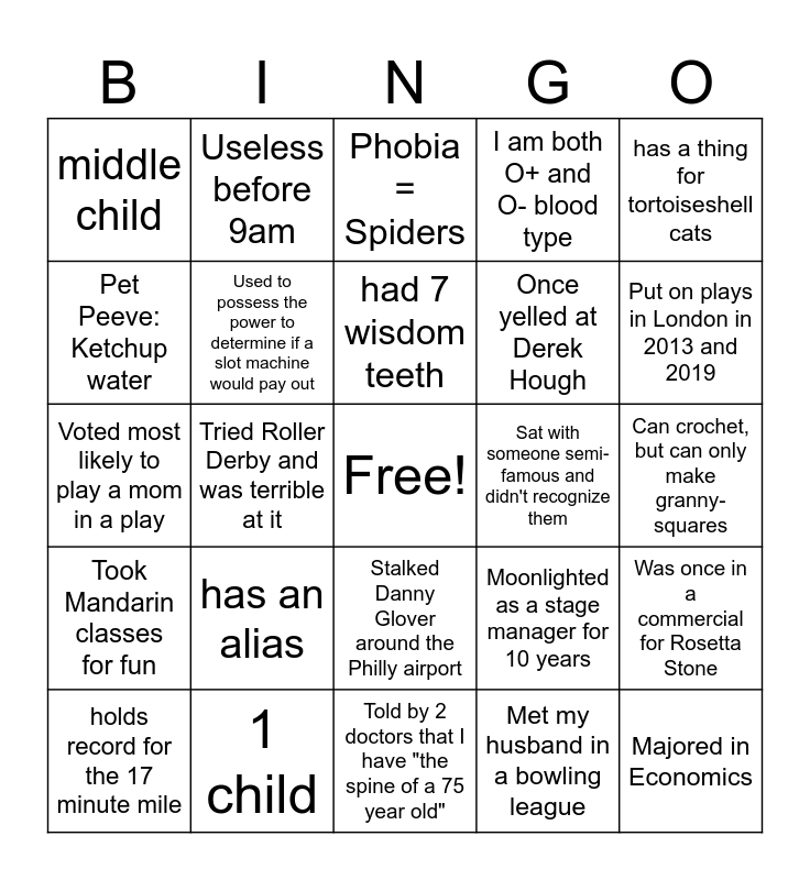 This bingo card has a free space and 24 words: has an alias, 1 child, had 7 wisdom teeth, holds record for the 17 minute mile, has a thing for tortoiseshell cats, middle child, Pet Peeve: Ketchup water, Useless before 9am, Sat with someone semi-famous and didn't recognize them, Stalked Danny Glover around the Philly airport, Once yelled at Derek Hough, Voted most likely to play a mom in a play, Moonlighted as a stage manager for 10 years, Was once in a commercial for Rosetta Stone, Used to possess the power to determine if a slot machine would pay out, Met my husband in a bowling league, Can crochet, but can only make granny-squares, Phobia = Spiders, Put on plays in London in 2013 and 2019, Tried Roller Derby and was terrible at it, Majored in Economics, Took Mandarin classes for fun, I am both O+ and O- blood type and Told by 2 doctors that I have "the spine of a 75 year old".