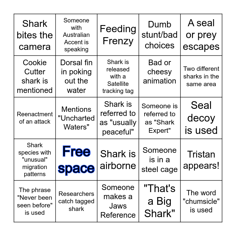 This bingo card has 25 words: Free space, Someone makes a Jaws Reference, Shark is released with a Satellite tracking tag, The phrase "Never been seen before" is used, A seal or prey escapes, Shark bites the camera, Cookie Cutter shark is mentioned, Someone with Australian Accent is speaking, Someone is referred to as "Shark Expert", Shark is airborne, Bad or cheesy animation, Reenactment of an attack, Someone is in a steel cage, Tristan appears!, Dorsal fin in poking out the water, The word "chumsicle" is used, Seal decoy is used, Feeding Frenzy, Two different sharks in the same area, Mentions "Uncharted Waters", Shark is referred to as "usually peaceful", Researchers catch tagged shark, Shark species with "unusual" migration patterns, Dumb stunt/bad choices and "That's a Big Shark".