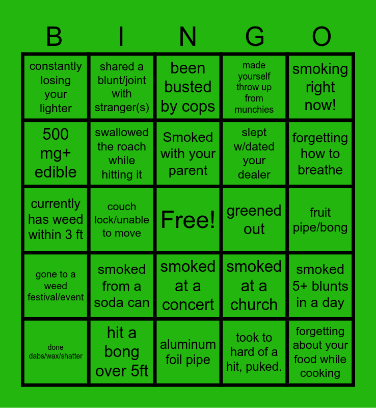This bingo card has a free space and 24 words: done dabs/wax/shatter, smoked from a soda can, Smoked with your parent, took to hard of a hit, puked., smoking right now!, constantly losing your lighter, shared a blunt/joint with stranger(s), been busted by cops, greened out, fruit pipe/bong, currently has weed within 3 ft, swallowed the roach while hitting it, smoked at a church, smoked 5+ blunts in a day, 500 mg+ edible, hit a bong over 5ft, aluminum foil pipe, made yourself throw up from munchies, forgetting how to breathe, gone to a weed festival/event, couch lock/unable to move, smoked at a concert, slept w/dated your dealer and forgetting about your food while cooking.