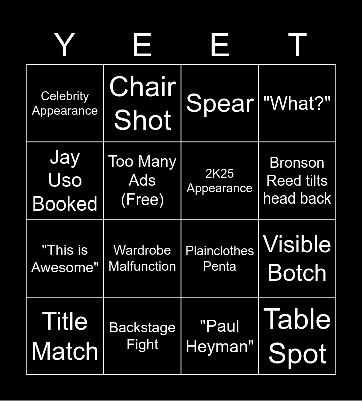 This bingo card has 16 words: Backstage Fight, Visible Botch, Spear, Celebrity Appearance, "This is Awesome", Chair Shot, Plainclothes Penta, "Paul Heyman", Jay Uso Booked, Too Many Ads (Free), Title Match, "What?", Wardrobe Malfunction, Bronson Reed tilts head back, 2K25 Appearance and Table Spot.