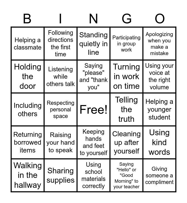 This bingo card has a free space and 24 words: Raising your hand to speak, Sharing supplies, Saying "please" and "thank you", Walking in the hallway, Apologizing when you make a mistake, Helping a classmate, Holding the door, Following directions the first time, Telling the truth, Keeping hands and feet to yourself, Turning in work on time, Including others, Cleaning up after yourself, Using kind words, Listening while others talk, Saying "Hello" or "Good Morning" to your teacher, Helping a younger student, Standing quietly in line, Using your voice at the right volume, Respecting personal space, Giving someone a compliment, Returning borrowed items, Participating in group work and Using school materials correctly.